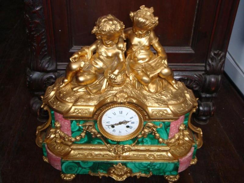 19TH CENTURY MUSEUM QUALITY 3 PIECE GILT BRONZE MALACHITE CHERUB CHILDREN CLOCK SET