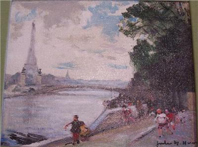 An Original Oil on CanvasPainting byRenowned A Beautiful Original Oil on Canvas by Artist Jules Rene Herve (French 1887-1981). Titled "Sur la Seine". Painting depicts people looking out the Seine River and Eiffel Tower. Signed on bottom right and on Reverse of Canvas. Painting is adorned in a Velvet Mint Green Border andFramed in an Antique Gilt WoodenGold Frame. Excellent Condition. Gallery Retail Price: $14,000.