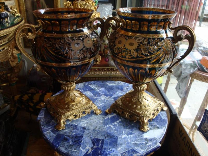 PAIR MAGNIFICENT ITALIAN CRYSTAL BRONZE CENTERPIECE VASE URNS